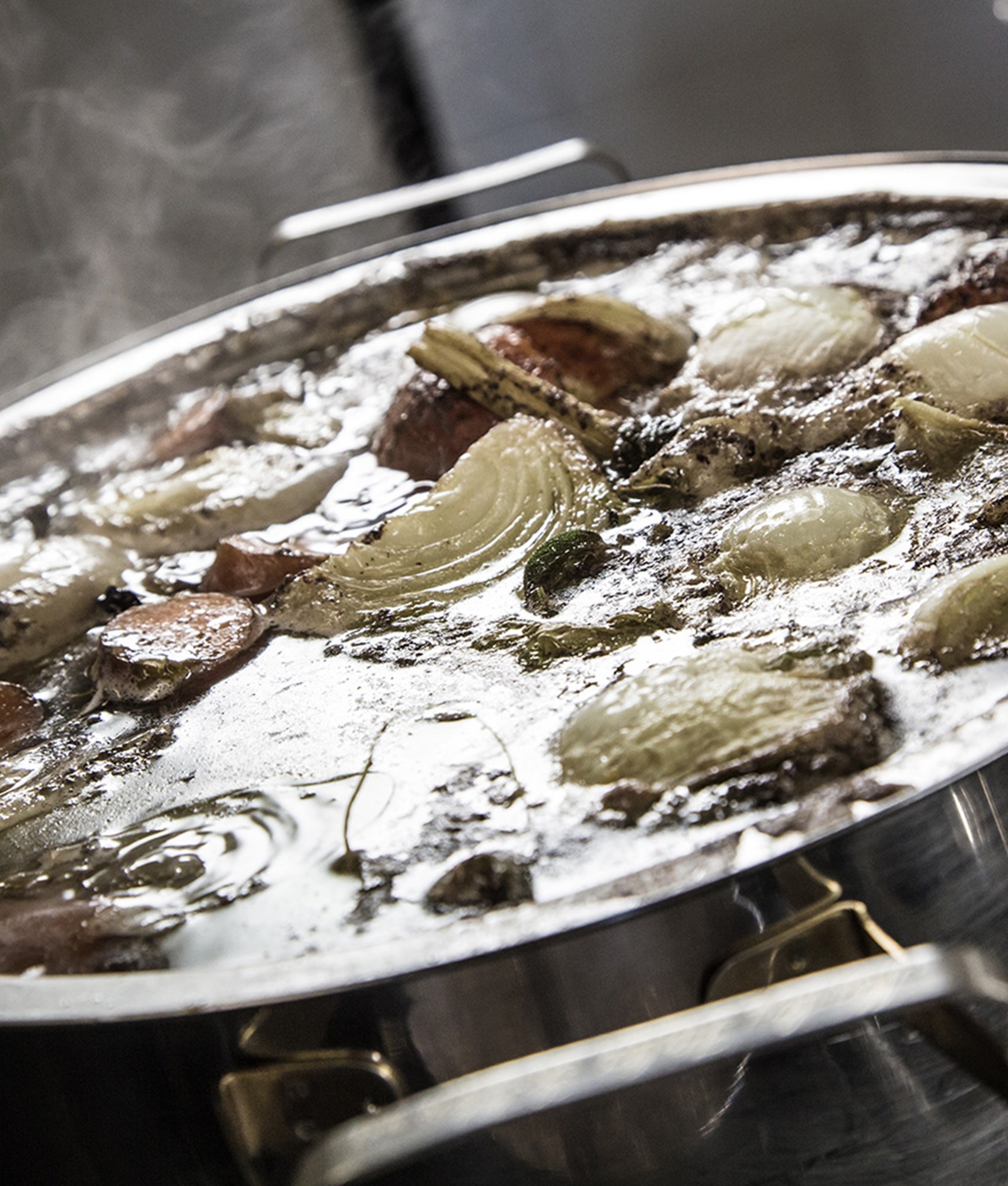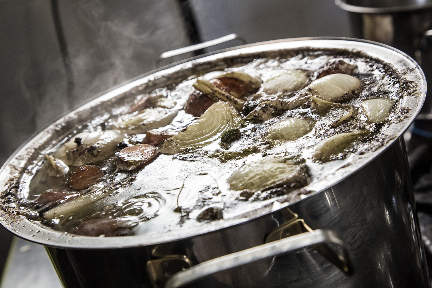 In the next phase the bones are put into a cooker together with water, vegetables, herbs and spices for slow cooking.